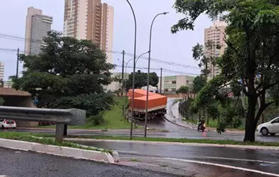 Em uma manhã chuvosa na Capital, o dia iniciou com um transtorno extra para quem circula pela região do Viaduto Pedro Chaves dos Santos, nesta quarta-feira (4). Uma carreta com dois reboques não conseguiu vencer a rampa de acesso e acabou atravessada na alça, bloqueando totalmente o trecho por volta das 5h40.