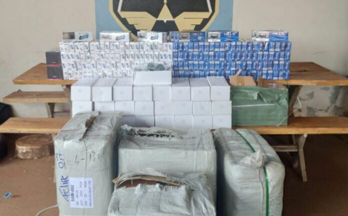 Durante vistoria, foram localizados no veículo 199 pacotes de cigarro, além de diversos objetos produto de descaminho.