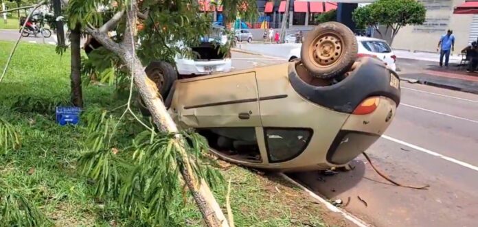 Carro capota no canteiro central da Avenida Afonso Pena após bater em árvore