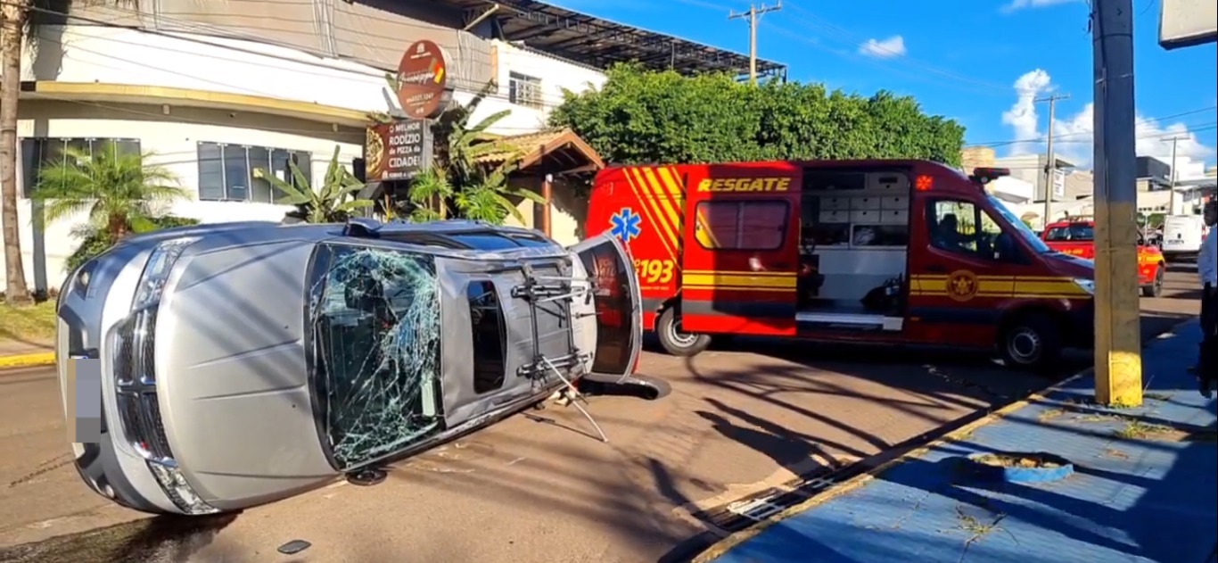 Um acidente de trânsito na tarde dessa quinta-feira (02), em Campo Grande, deixou um veículo tombado e outro com a parte frontal destruída.