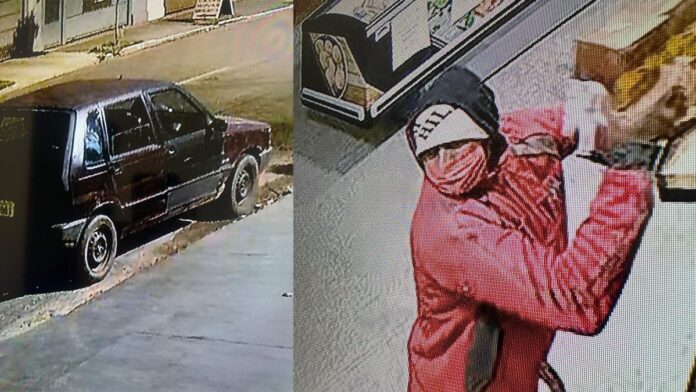Segundo o registro da ocorrência, a quadrilha chegou até o estabelecimento em um veículo, modelo Fiat Uno. Em seguida, dois deles saíram e usaram uma marreta para quebrar a porta de vidro e entrar.