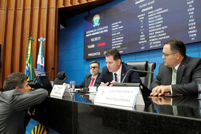 Deputado Renato Câmara (ao centro), ao defender seus projetos e indicações no plenário da Assembleia Legislativa de MS. (Foto: Igor Silva)