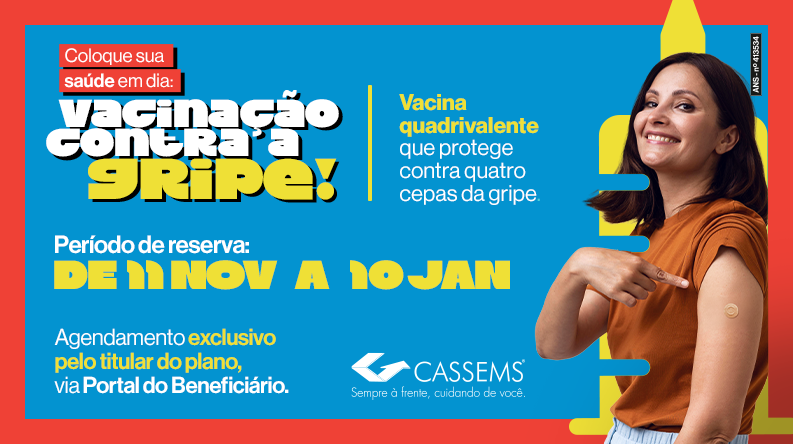 A vacina aplicada é quadrivalente, oferecendo proteção ampliada contra quatro cepas do vírus influenza. O período de reserva das doses ocorre de 10 de novembro a 10 de janeiro, e o agendamento deve ser feito exclusivamente pelo titular do plano, por meio do Portal do Beneficiário, pelo link: https://beneficiario.cassems.com.br/