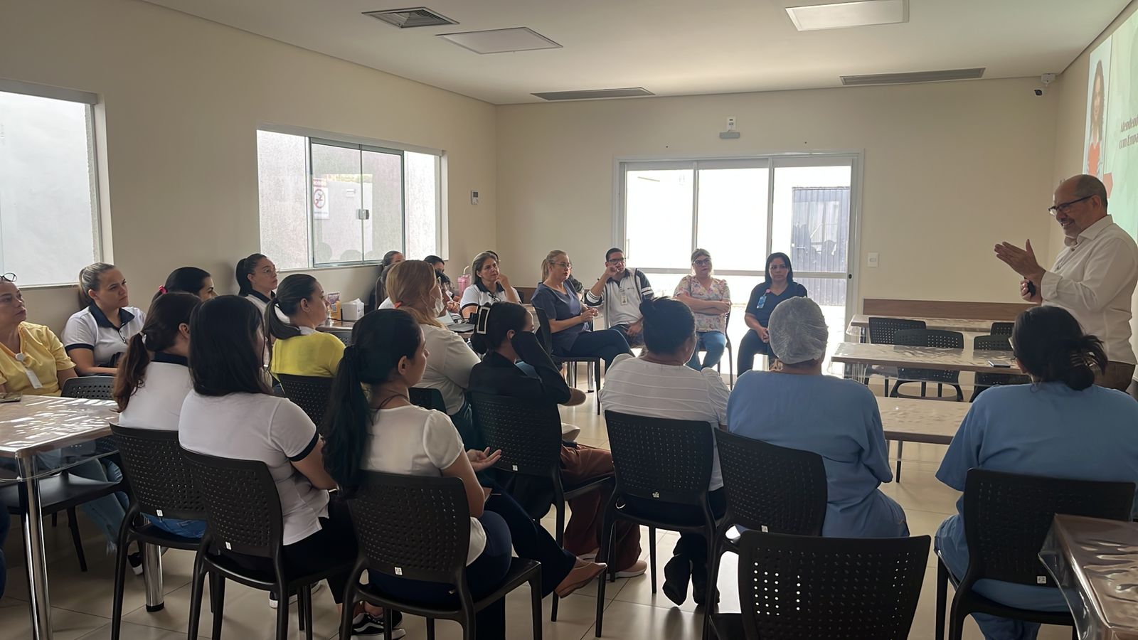 Um dos momentos mais marcantes do treinamento foi a exibição de um vídeo que retrata os desafios emocionais enfrentados por diferentes pessoas dentro de um ambiente hospitalar. A dinâmica trouxe reflexão e emocionou os participantes ao mostrar que, por trás de cada prontuário, existe uma história de vida que merece respeito e carinho.