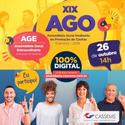 A Caixa de Assistência dos Servidores do Estado de Mato Grosso do Sul (Cassems) realiza, no dia 26 de outubro, às 14h, a “19ª Assembleia Geral Ordinária (AGO) de Prestação de Contas” e “Assembleia Geral Extraordinária (AGE)”. A AGO acontece todo ano, em abril, porém, devido à pandemia do novo coronavírus, em 2020, ela será realizada, excepcionalmente, via on-line. Mesmo à distância, o evento espera a participação dos servidores estaduais que são beneficiários da Cassems, contudo, apenas os titulares do plano de saúde têm direito ao voto. Para participar da AGO/AGE, o beneficiário deve acessar o seguinte endereço: assembleia.cassems. com.br.