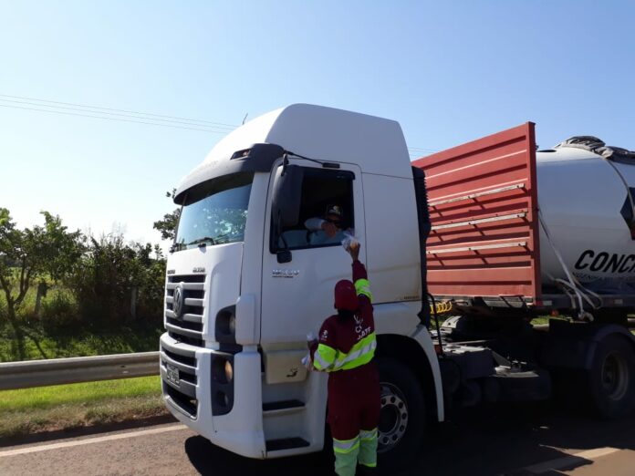 Os caminhoneiros receberão, ainda, um kit composto por um suco, dois pacotes de biscoito salgado, um doce e uma máscara de tecido para reforçar os cuidados preventivos à Covid-19.