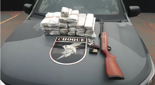 Em diligência, foram localizados 20 quilos de maconha, em um cômodo afastado da casa principal. Já no interior da casa, foi encontrado um revólver calibre .38, com quatro munições, uma espingarda de pressão modificada para calibre 22 e mais 27 munições calibre 22.