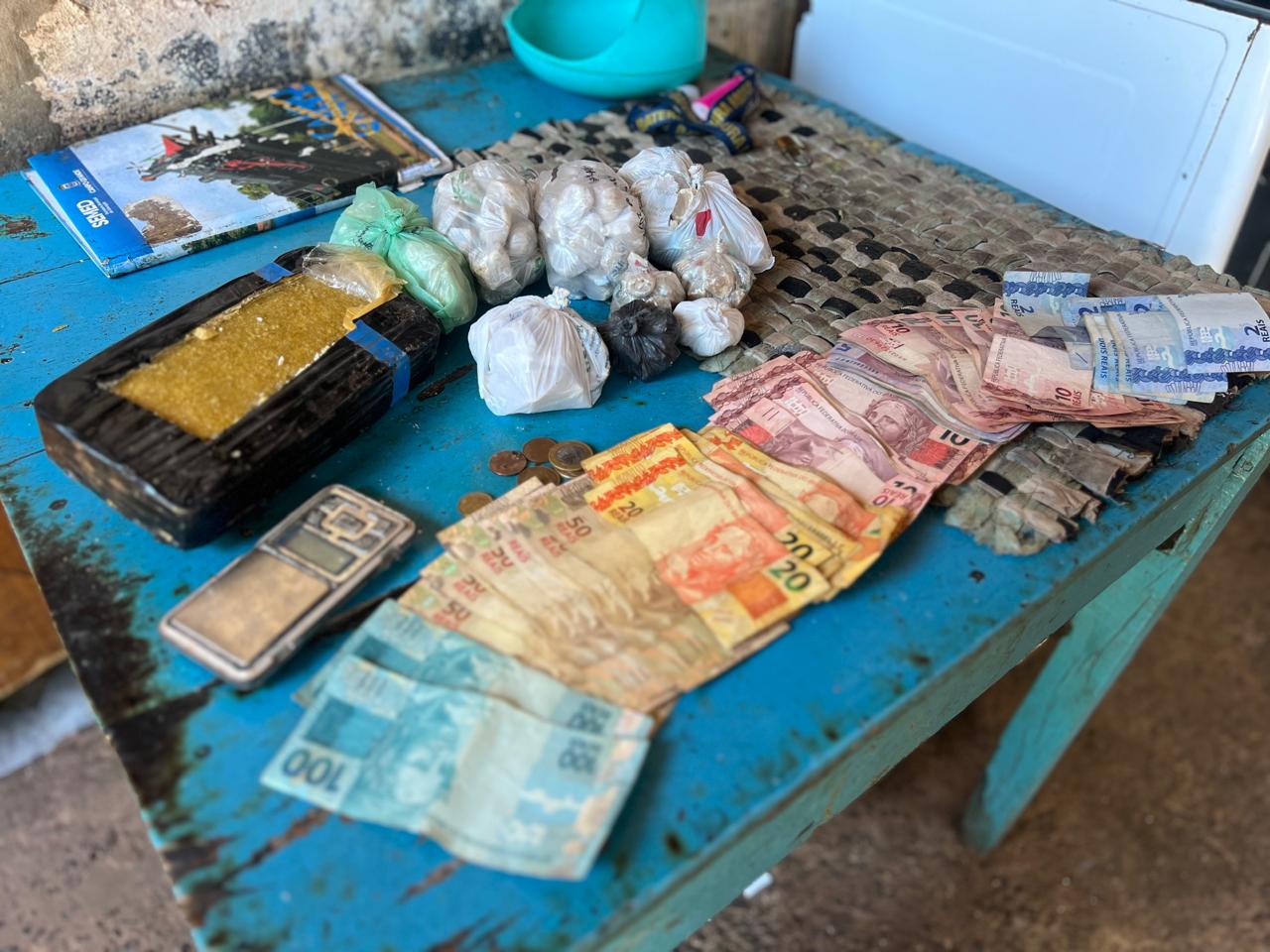 Logo, após a varredura, foram encontrados em um cômodo, nos fundos, em meio a escombros, diversas porções de pasta base, além de um tablete da mesma substância e R$ 1.275,00 em espécie.