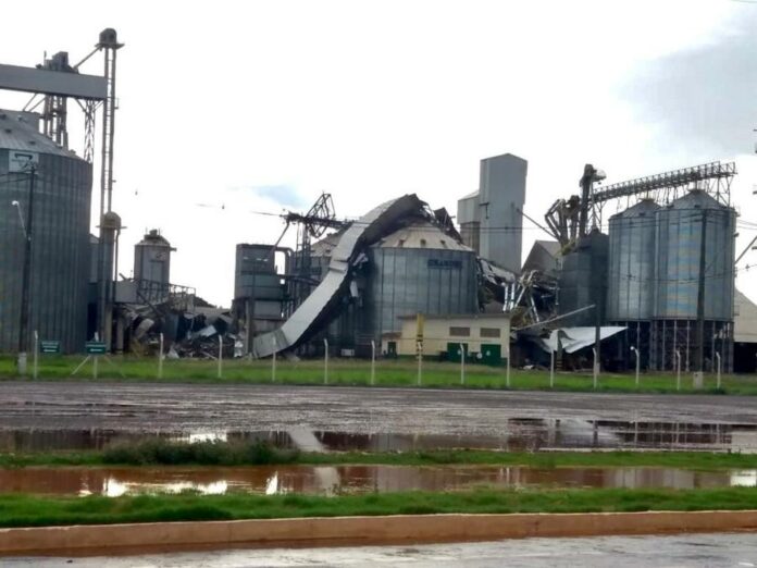 Os ventos fortes durante a tempestade que passou pela região de Nova Andradina, na tarde de ontem (16), atingiu e destruiu parte do silo de uma cooperativa localizada às margens da rodovia MS-473.