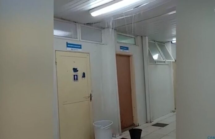 Imagens compartilhadas nas redes sociais mostram uma grande quantidade de água caíndo pelo teto dessas unidades, que apresentam rachaduras. Por conta da água acumulada, o forro desceu e por muito pouco não desmoronou.