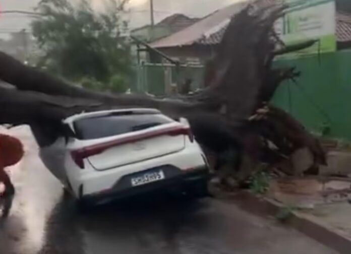 Chuva rápida derruba árvore sobre carro em Campo Grande
