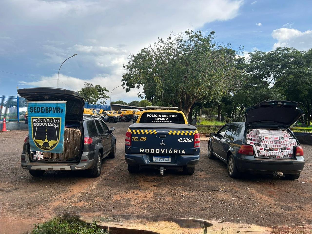 O primeiro flagrante foi de um veículo Palio Weekend, carregado com 400 pacotes de cigarros de origem estrangeira, além de três bolas de pneus contendo cinco unidades cada e outros produtos descaminhados.