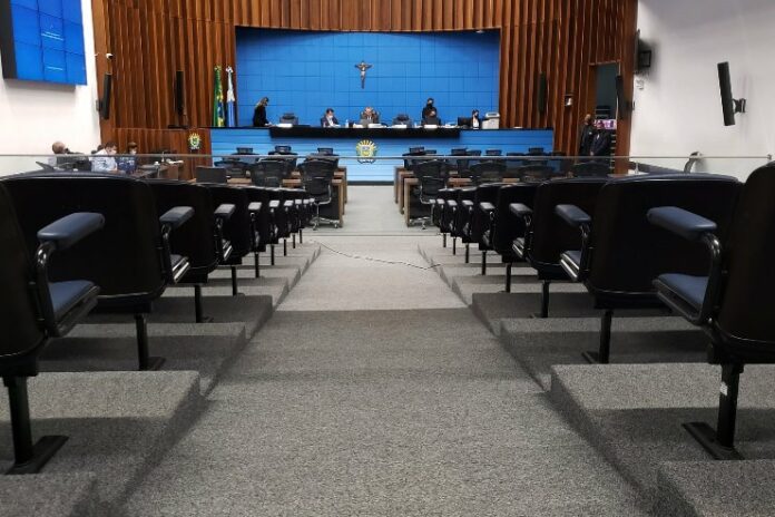 Plenário da ALEMS, onde são realizadas as sessões ordinárias; neste período de pandemia, a participação da maioria dos parlamentares é remota (Foto: Luciana Nassar)