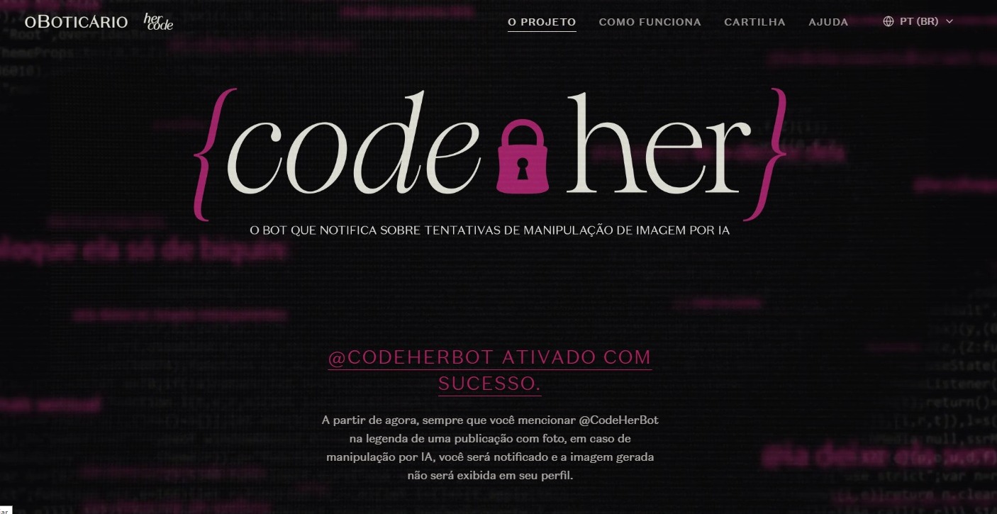 O medo de ser exposta publicamente em imagens falsas criadas com inteligência artificial tem crescido significativamente entre as mulheres ao longo dos últimos anos, especialmente por conta do avanço das plataformas de inteligência artificial (IA) e ferramentas de manipulação. Para auxiliar, orientar e proteger contra este tipo de crime, o Boticário, empresa brasileira de cosméticos, lançou o movimento Code Her, que disponibiliza um bot capaz de alertar as tentativas de modificação e sexualização de fotos por IA e também uma cartilha digital com informações sobre como denunciar e agir diante dessa situação.