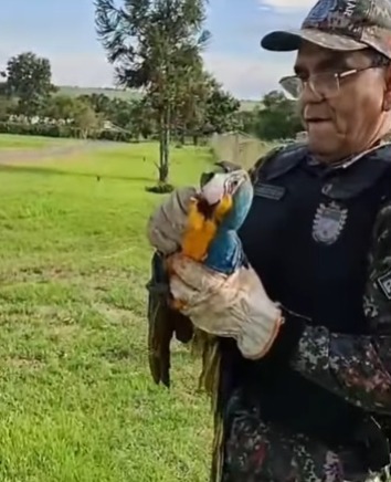 Uma arara-canindé, conhecida pelas suas cores azul e amarelo, foi resgatada pela Polícia Militar Ambiental (PMA) em uma área verde situada no bairro Chácara das Mansões, em Campo Grande.