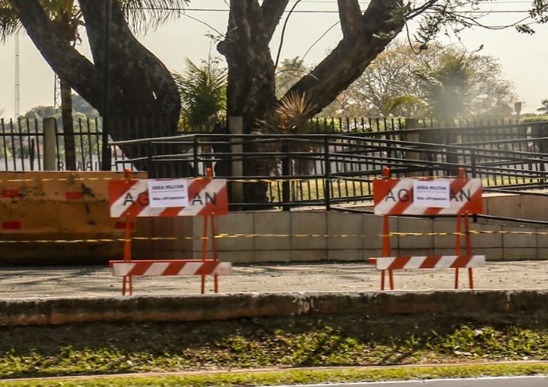 Foram instalados diversos cavaletes, cedidos pela Agência Municipal de Transporte e Trânsito (Agetran) de Campo Grande, interligados com faixa zebrada, contendo a mensagem “Área Militar. Não Ultrapasse!”.