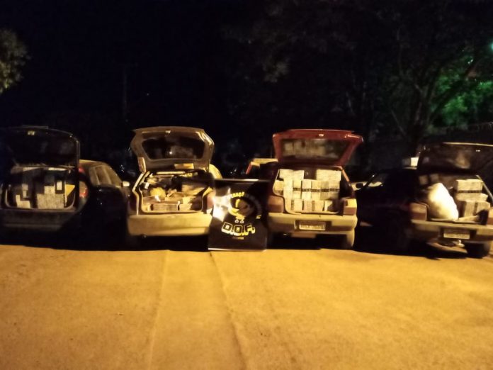 Um comboio com 4 veículos carregados de produtos contrabandeados do Paraguai foi apreendido pelo Departamento de Operações de Fronteira (DOF) em uma estrada vicinal, no município de Nova Alvorada do Sul. Quatro pessoas com idades entre 26 e 45 anos foram autuadas pelo crime de contrabando e descaminho.