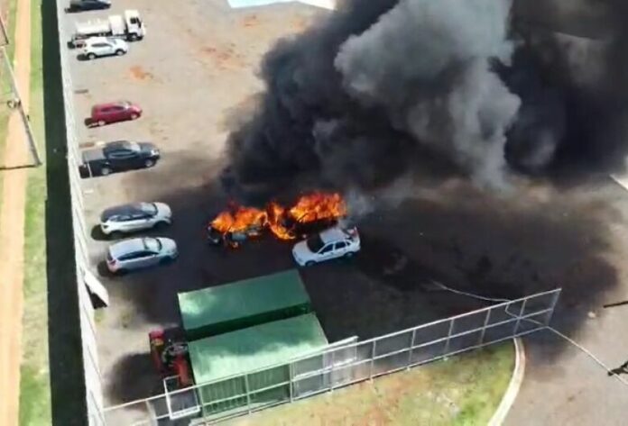 Um incêndio de grandes proporções destruiu três veículos que estavam estacionados no pátio da sede do Departamento de Operações da Fronteira (DOF), em Dourados, na tarde desta quarta-feira (25).