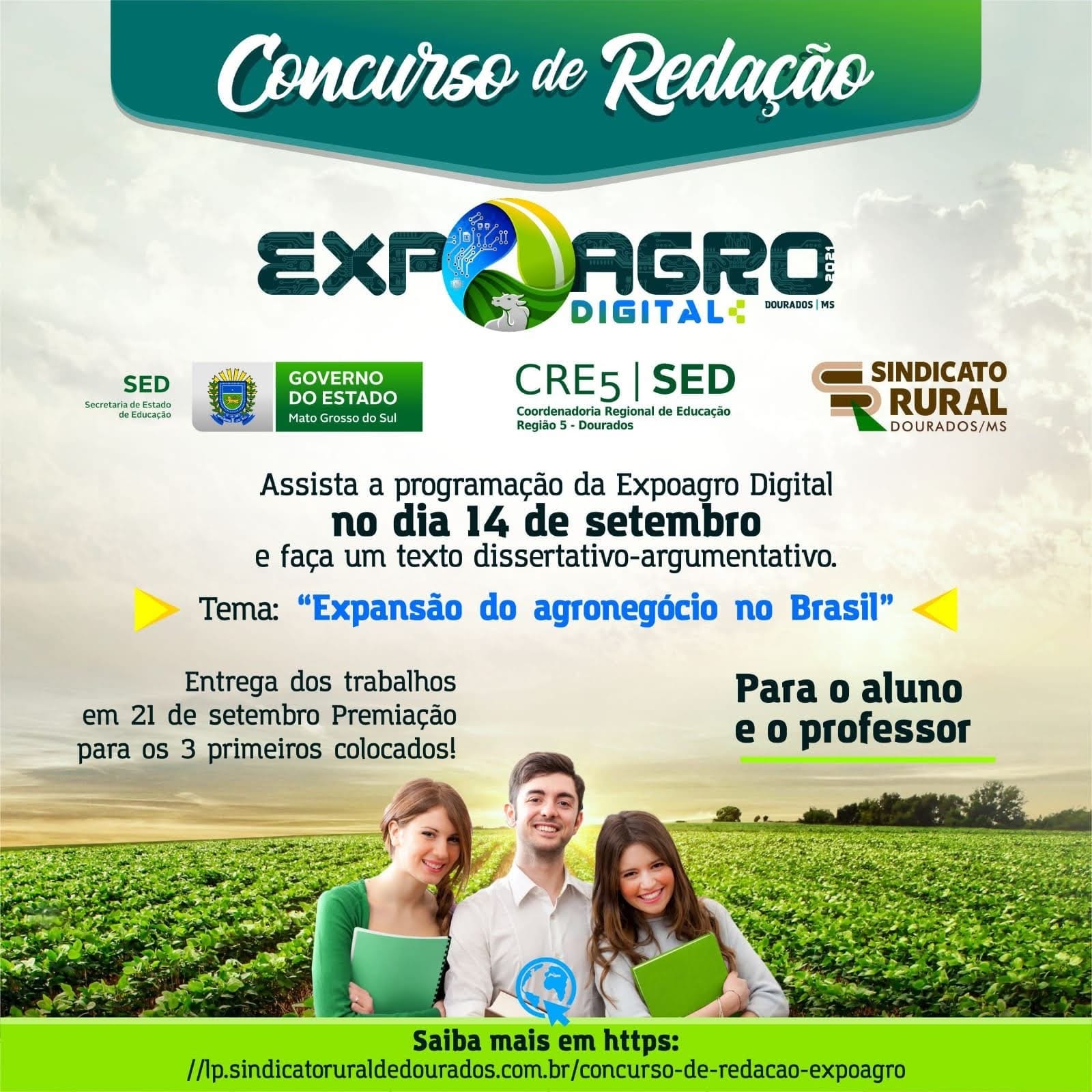 Os alunos matriculados no terceiro ano do ensino médio das escolas estaduais de Dourados, podem participar do 1º Concurso de Redação – Expoagro Digital. O evento promovido pelo Sindicato Rural de Dourados, com o apoio da Secretaria Estadual de Educação (SED/MS), entregará prêmios aos vencedores.