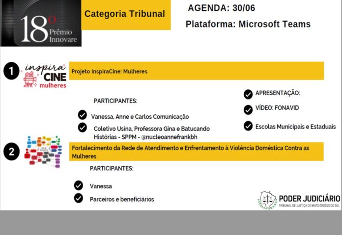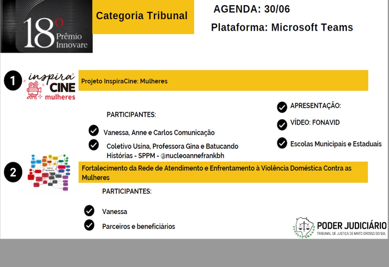 Para a segunda juíza foram inscritas as ações Mãos EmPENHAdas contra a Violência; ATITUDE – Grupo Reflexivo de Mulheres; Protetivas on-line. Na categoria Tribunal estão concorrendo o Projeto InspiraCine: Mulheres, Fortalecimento da Rede de Atendimento e Enfrentamento à Violência Doméstica Contra as Mulheres, Projeto Dialogando Igualdades e o Prêmio de Jornalismo do Tribunal de Justiça de Mato Grosso do Sul.
