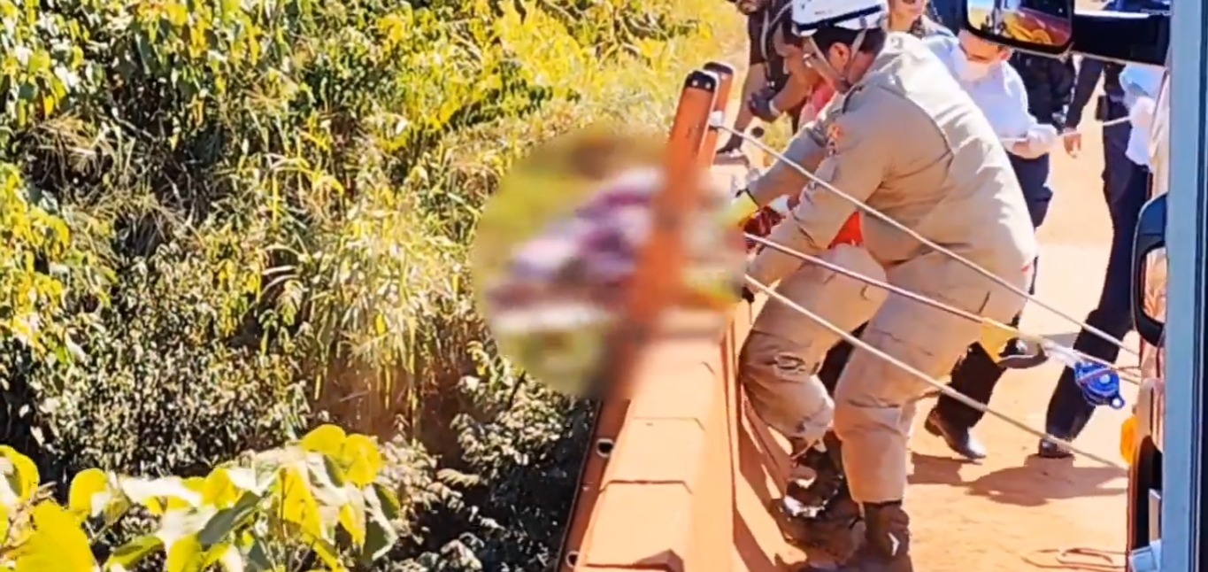 Corpo foi retirado pelo Corpo de Bombeiros com o auxílio de uma escada (Foto: Redes Sociais)