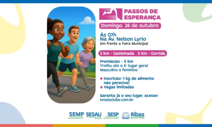 No próximo domingo, 26 de outubro, Ribas do Rio Pardo será palco de um evento especial que une esporte, solidariedade e qualidade de vida: a corrida e caminhada “Passos de Esperança”. A largada será às 07h, na Avenida Nelson Lyrio, em frente à Feira Municipal.