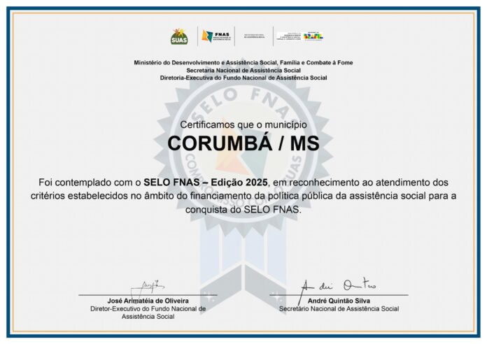 Corumbá recebeu o SELO FNAS – Edição 2025, uma certificação do Ministério do Desenvolvimento e Assistência Social, Família e Combate à Fome, que foi concedida através da Secretaria Nacional de Assistência Social e da Diretoria-Executiva do Fundo Nacional de Assistência Social. O reconhecimento é um destaque para quem atende aos critérios estabelecidos no financiamento da política pública da assistência social.