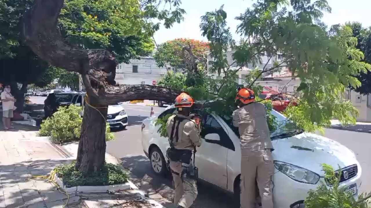 A equipe militar também precisou retirar outro galho de árvore, essa de grande porte, que caiu em cima de um veículo estacionado na rua Cuiabá, no centro.
