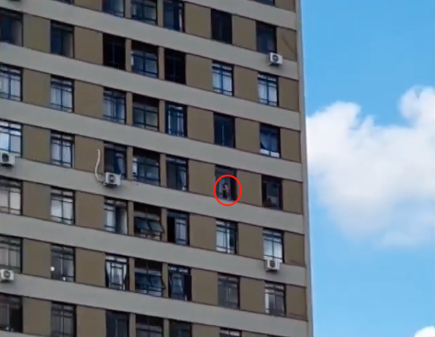 O vídeo de vinte segundos, que viralizou nas redes sociais, mostra o menino já do lado de fora da janela, se movimentando sobre no parapeito, pelo que parece ser o decimo andar do prédio, anda pela estrutura e se apoia na janela, sem ninguém aparece para tirar a menino do local.