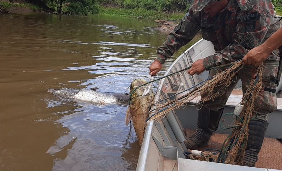 A Polícia Militar Ambiental (PMA) em fiscalização no rio Miranda, no município de Jardim, extraiu rede de pesca com quatro pintados e um jaú de grande porte, já podres, pesando 40 quilos, ontem (21). Os policias ainda retiraram do rio mais 27 anzóis de galho que estavam armados.
