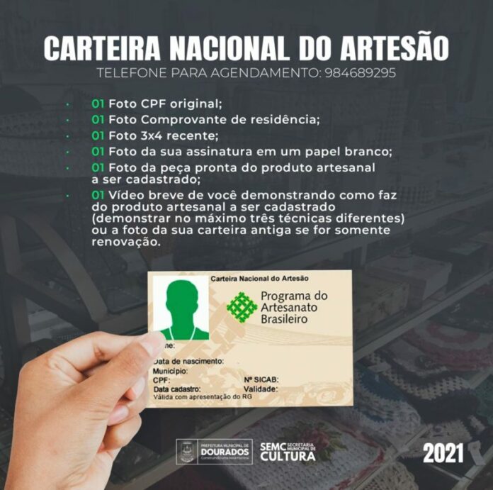 A SEMC (Secretaria Municipal de Cultura) abriu o cadastro dos artesões douradenses para o encaminhando de documentos exigidos pela FCMS (Fundação de Cultura de Mato Grosso do Sul) para obter a Carteira Nacional do Artesão.