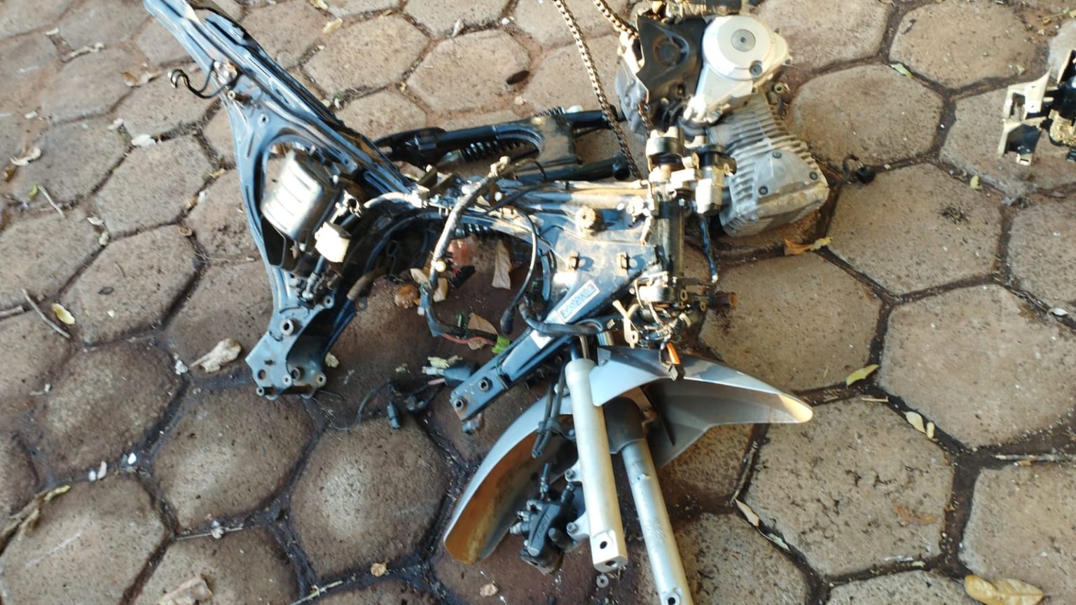 Na sexta-feira (07), a equipe foi até o local e encontrou uma motocicleta, modelo Honda Fan 160 cc, totalmente desmontada e já faltando algumas partes.