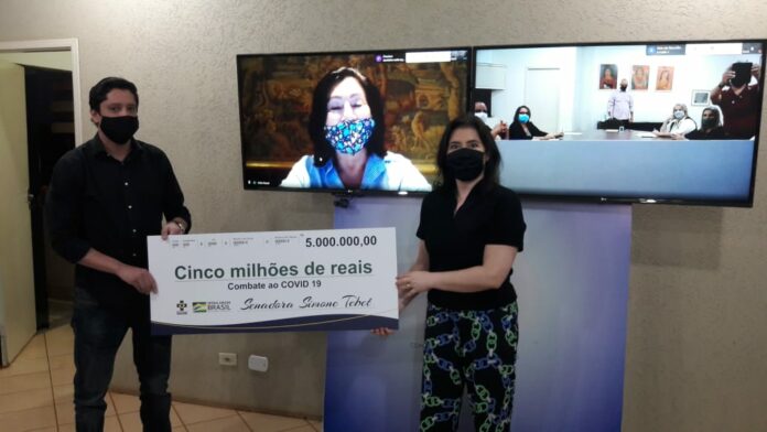 O agradecimento foi feito pela prefeita à senadora durante a transmissão, sendo que Simone Tebet fez a entrega simbólica de um cheque de R$ 5 milhões, valor que já está depositado na conta da Prefeitura.