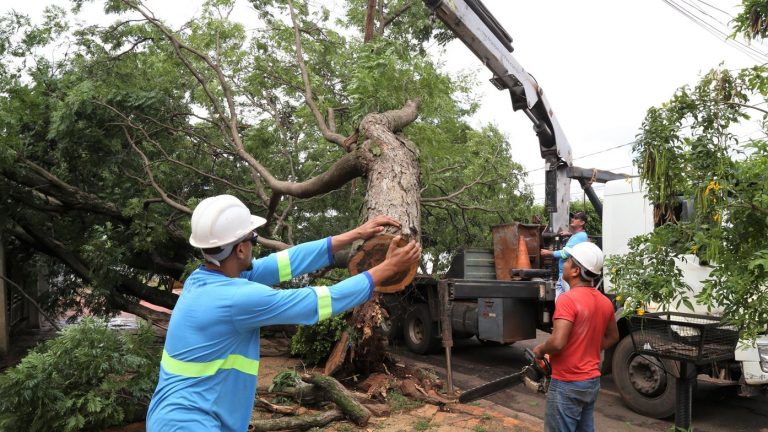 Outra frente de serviço em ritmo acelerado é o de remoção de árvores e galhos derrubados pelo vendaval. Na Rua Itiquira, no Bairro Santa Fé, por exemplo, a remoção de uma sibipiruna que caiu sobre a grade da casa de dona Suely Nascimento começou por volta das 9 horas e se estendeu até às 11 horas.