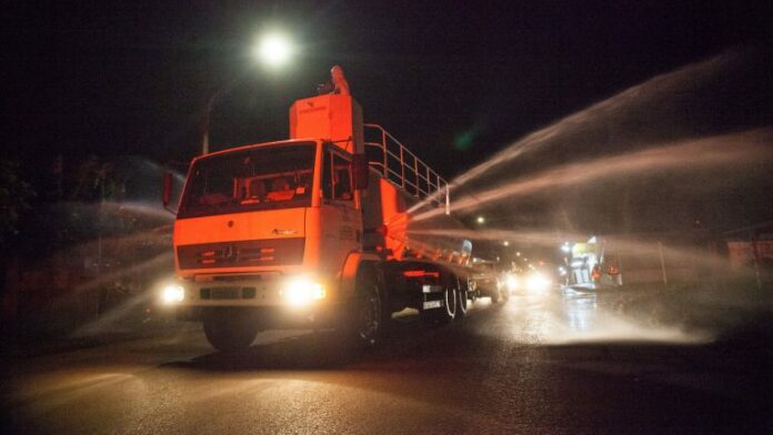 Para a limpeza dos locais, deverão ser utilizados dois caminhões pipas – cada um com capacidade para 25 mil litros de água e hipoclorito de sódio, dois canhões dispersores, dois vaporizadores e duas bombas costais em cada ação.