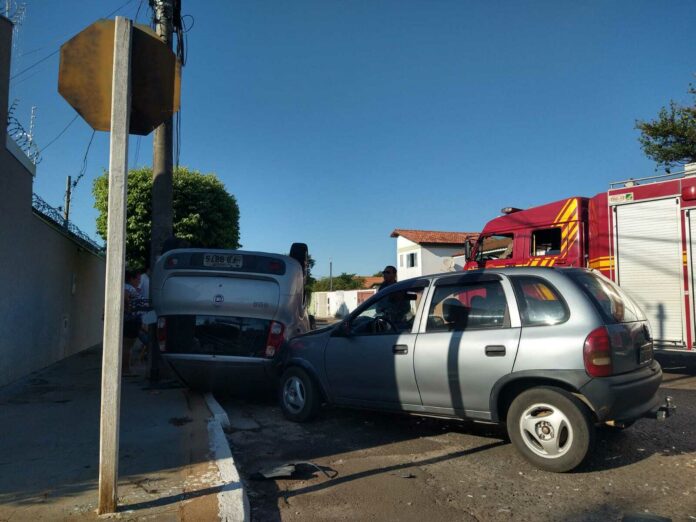 A segunda-feira (14) começou agitada no trânsito da Capital. Ao atravessar um cruzamento sem obedecer a sinalização de Pare, entre as ruas Madri e Astúrias, na Vila Alba, um veículo de modelo Uno capotou, parando com as quatro rodas para cima, após ser atingido por um outro carro que seguia pela via.
