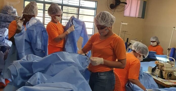Dedicação e trabalho responsável das mulheres em situação de prisão do município de Três Lagoas tem garantido Equipamentos de Proteção Individual (EPIs) ao Hospital Nossa Senhora Auxiliadora (HNSA), referência no tratamento de pacientes com coronavírus na região. Em média, são confeccionados semanalmente 300 capotes, além de 1.200 máscaras em tecidos.