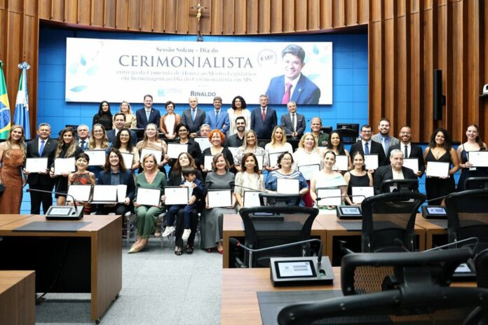 Em reconhecimento ao trabalho essencial e à dedicação dos profissionais que organizam e coordenam eventos, a Assembleia Legislativa de Mato Grosso do Sul (ALEMS) realizou, na noite desta terça-feira (28), a Sessão Solene em Comemoração ao Dia do Cerimonialista, proposto pelo deputado Professor Rinaldo Modesto (Podemos). A solenidade aconteceu no Plenário Deputado Júlio Maia e reuniu autoridades, homenageados, familiares e profissionais do Cerimonial que atuam em diferentes segmentos.