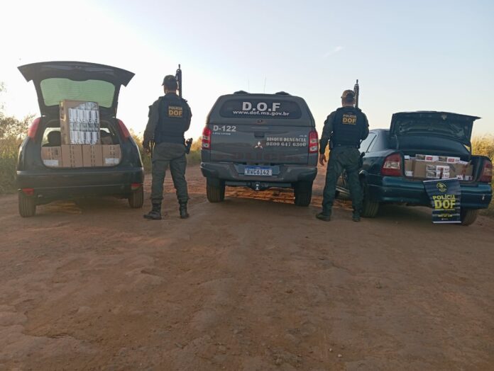 Diligências foram feitas, mas nenhum deles foi localizado. Ao conferir o interior dos carros, os policiais encontraram diversos pacotes de cigarros de marcas paraguaias.