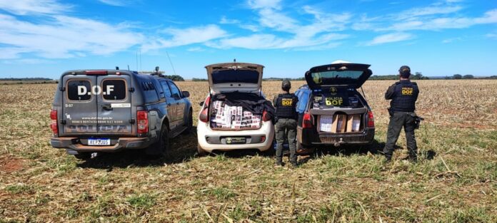 Com isso, foi descoberto que outro veículo, modelo Fiat Palio, fugiu por uma estrada vicinal. Durante buscas, foi localizado abandonado com 1.500 pacotes de cigarros.