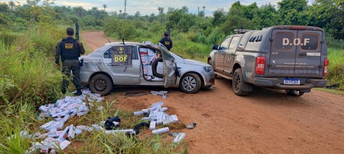 Ao se aproximar, os policiais deram de cara com vários pacotes de cigarros de marcas paraguaias esparramadas e dentro do veículo.