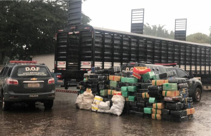 Policiais do Departamento de Operações de Fronteira (DOF) apreenderam na madrugada desta quinta-feira (4), em Coronel Sapucaia, um caminhão boiadeiro carregado com maconha e haxixe. A droga pesou quase 5 toneladas.