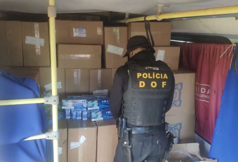 Os policiais do Departamento de Operações de Fronteira (DOF) apreenderam um veículo micro-ônibus, de cor branca, com placas de Poconé (MT), carregado com 10.700 pacotes de cigarros contrabandeados, de origem paraguaia, distribuídos em 214 caixas.