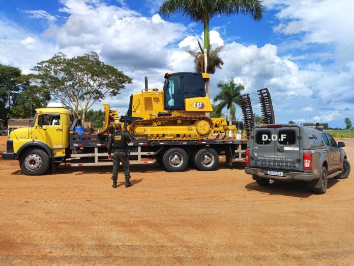 A ocorrência detalha que uma equipe do Departamento de Operações de Fronteira (DOF) fazia a fiscalização da rodovia estadual MS-276 quando avistou a carreta transportando o trator, modelo Caterpillar D-4 de cor amarela.