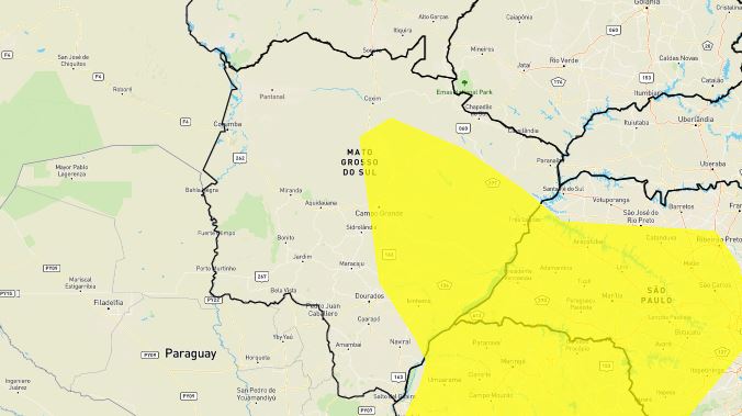 Além de Campo Grande, estão sob alerta as cidades de Água Clara, Anaurilândia, Angélica, Bandeirantes, Bataguassu, Batayporã, Brasilândia, Camapuã, Corguinho, Deodápolis, Douradina, Dourados, Fátima do Sul, Figueirão, Glória de Dourados, Inocência, Ivinhema, Jaraguari, Jateí, Naviraí, Nova Alvorada do Sul, Nova Andradina, Novo Horizonte do Sul, Paraíso das Águas, Ribas do Rio Pardo, Rio Brilhante, Rio Negro, Rio Verde de Mato Grosso, Rochedo, Santa Rita do Pardo, São Gabriel do Oeste, Selvíria, Sidrolândia, Taquarussu, Terenos e Três Lagoas.