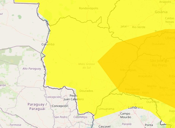 Estão sob alerta os municípios de Água Clara, Anaurilândia, Aparecida do Taboado, Bataguassu, Brasilândia, Cassilândia, Chapadão do Sul, Inocência, Jaraguari, Paraíso das Águas, Paranaíba, Ribas do Rio Pardo, Santa Rita do Pardo, Selvíria e Três Lagoas.