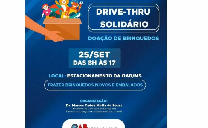 Realizado pela Comissão de Defesa dos Direitos da Criança e do Adolescente, da Ordem dos Advogados do Brasil, Seccional Mato Grosso do Sul (OAB/MS), o ‘Drive-Thru Solidário’ será neste sábado (25). A ação voluntária tem por objetivo arrecadar brinquedos novos que serão doados a crianças carentes para comemorar o Dia 12 de outubro.