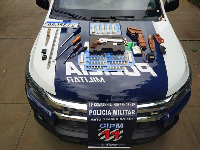 Dentro do carro foram encontradas várias caixas de munições e uma arma calibre 22, pertencentes ao morador, que é CAC (Colecionador, Atirador e Caçador).