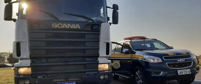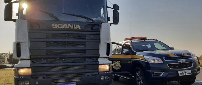 A equipe de policiais rodoviários federais deu ordem de parada no km 18 da BR-267, ao conjunto veicular Scania R124, de placas de Uberada (MG), atrelado a um semirreboque e conduzido por um homem.