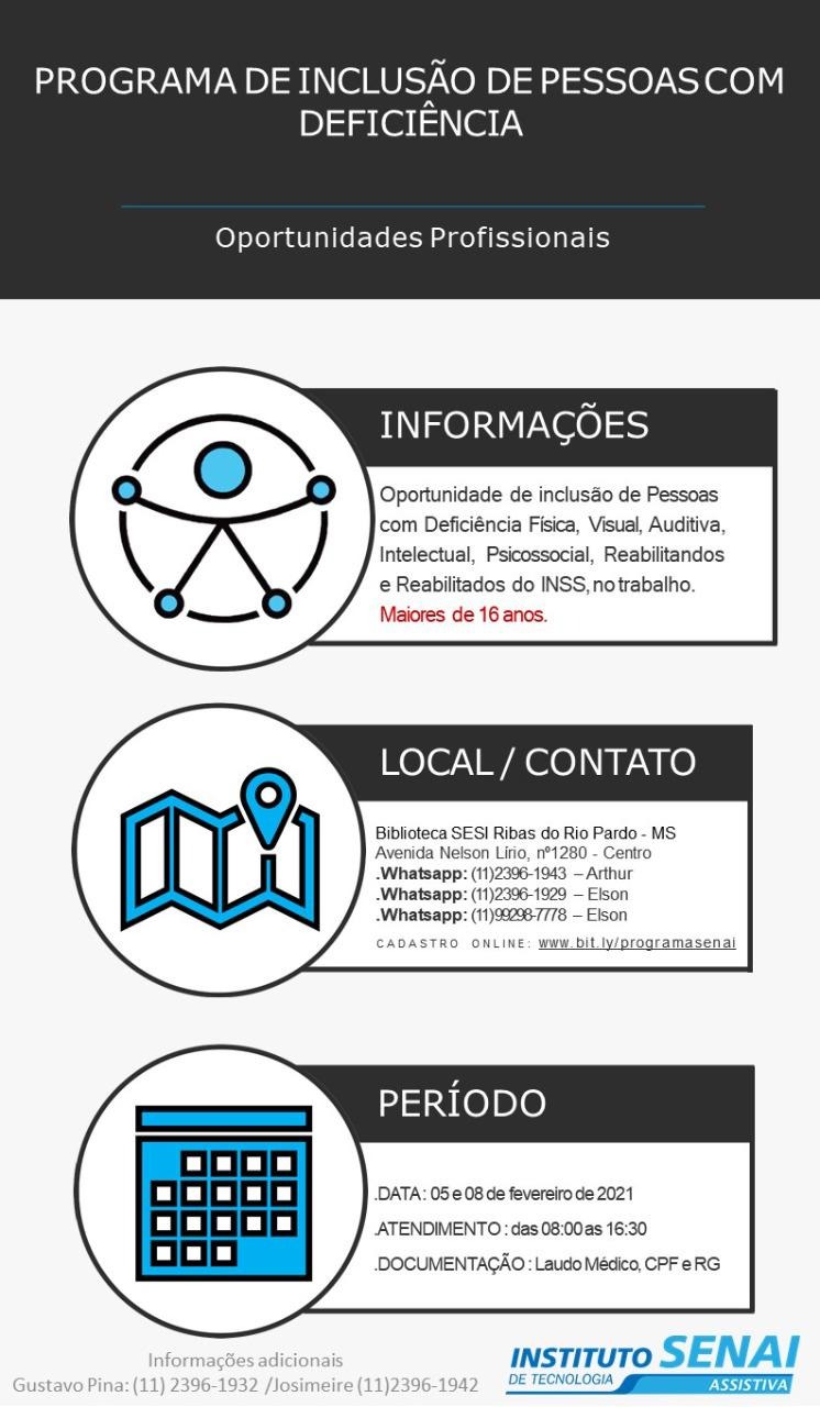 O Senai em parceria com a Suzano, Secretaria de Educação Municipal e Assistência Social, realizará a partir de sexta-feira (5) até o dia 8 de fevereiro o cadastramento de Pessoas com Deficiência (PcD) no programa de inclusão de pessoas com deficiência. Para se cadastrar, é necessário ser maior de 16 anos, apresentar laudo médico, RG e CPF.